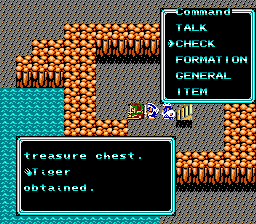 New area here with a grey floor. Work your way south a bit and then west to find some treasures – Life, Chariots and a Cap. Back east and take the staircase in the middle of this level. New area with a bright orange floor and narrow passageways. Not much to do here other than work your way south to an Elixir2 and a staircase nearby. Take the staircase and watch out for the damage spots on the floor – grab the Gold Key. Back up the stairs and continue south for another staircase, taking you back down into the grey floor area. Only way way to move here and that is east to a staircase going up. This puts us back to the first floor. Head south, go west for a second and wrap north (not up the bridge but north along the waterway). This leads to a staircase going down back to the 2nd floor that has a chest, the Tiger claw. No one can equip this at this time. With the Gold Key and Guo Tu in tow, you can now head out.