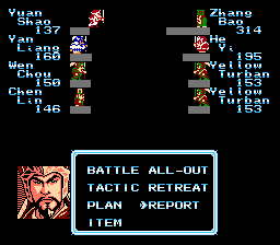 Victory in the Zhang Liang battle opens up a path to the east. You’ll come to a split which results in a cave to the south in the mountains and a long path to the northeast that leads to Zhang Bao. For now, head back to Ye and buy some new armor/weapons if needed and rest. Then make the trip to the far northeast to reach Zhang Bao’s compound. He is waiting there with He Yi and some Yellow Turban forces. Zhang Bao’s main attack will be Flame. Plan to have Yan Liang use Cleave on He Yi and gang up on him to route him right away. Yuan Shao can use his huge force and Dao to attack Zhang Bao. Should be an easy victory.