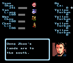 Spend some time outside going up a level or two. I got a Dao for Yuan Shao and he now is attacking three times at a beastly amount. You will notice that the Plan ability allows you to not need the Inn as often which is nice. After you have gained a level or two, head south and you will be ambushed by Bo Cai and some Yellow Turban forces. This battle shouldn’t be too hard, just gang up on Bo Cai early on and then it should be a rout. He gives you some directional advice upon defeat and this opens up access to a large area of land to the south and southeast. Not much to do however as you will come across a gate that leads to Dong Zhuo’s area, although like the original DoaE, you cannot continue onward here currently.