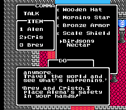 When you get outside and walk a few steps, Brey and Cristo will join you. First of all, Alena is a fighter and will have really high agility and good attack with a high propensity to get critical hits. Cristo is a “Chancellor”, and he specializes in healing/white/infernus magic and also is a force with his ability to equip a lot of weapons and armor. Brey is a dangerous Wizard who is a liability when fighting in battle as his low defense means he will die on you. He has some really nice spells. Build up a few levels and get a Thorn Whip for Alena and some defensive gear for Brey (Leather Shield/Hat). Then a Thorn Whip for Cristo. Alena should be okay on defensive gear thanks to the Feather Hat.