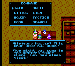 Great weapons and armor are stored here. A Morning Star and Venomous Dagger are vital for Cristo and Brey, respectively. The Scale Shield can aid those two as well, and the Bronze Armor is good for Cristo. West of the Inn is a purple woman and a bunch of barrels; search the two for a Strength Seed and a Gum Pod. I think the Gum Pod is worthless save for a few gold coins after being sold. A Santeem guard will find you and tell you to go see the king immediately! Hmm, well go Return there. You will hear that the king cannot speak, and that the chancellor tells you to talk to Goz out back. Well you have a Thief’s Key, so you can enter his house (just jump out your window as if you were escaping). Goz tells the tale of Marone, whose voice was once out too. He is in Surene and he probably knows what to do. Talk to him (second floor balcony of the House of Healing). He refers you to a Bazaar, one that you have already been to. So go back here and it’s the item shop owner (talk to him from the side, not from the desk) that tells you to go west to the Birdsong Tower.