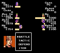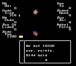 The next round I had Pang Tong use Bei Ji on himself, and everyone else used Power Pills on Zhou Yu. Zhou Yu broke out of Yi Xin, but he was under 1,000 soldiers?well within the range of any of my officers. I had Pang Tong cast Hong Shui to try and get him (not sure if he could take down 800 soldiers) and everyone else used Power Pills again. Pang Tong missed, but Zhou Yu died on the next attack. Everyone proceeded to tear into Gu Yong.
