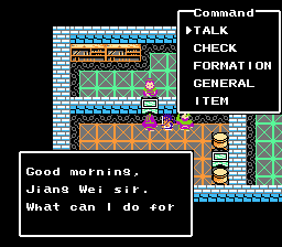 Not many sprites were changed, though some were. Liu Bei became the Soldier class from Dragon Warrior 3. Zhang Fei became the hero in Dragon Warrior 1. Guan Yu became the random soldier-type you’d find around towns in Dragon Warrior 3. Other than that, they changed the guards sprite to be the guard in Dragon Warrior 1 (and in turn characters with that sprite like Xu Huang, Liang Gang, etc took on that sprite). Also they changed the female sprite that is sitting next to Tao Qian to the old man in Dragon Warrior 3 (though this sprite is only used at the beginning at Xu Zhou).