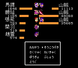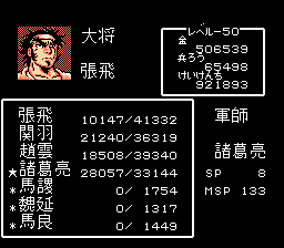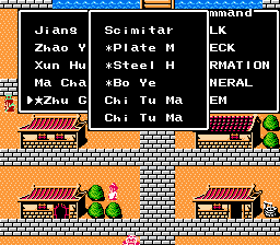 My least favorite bug: The randomly vanishing treasures. On many game runs (at first I thought it was my old cartridge, but then I learned it was a flaw of the game itself) I discovered that certain items vanish early (this includes a club hidden in a house, and the sword under the Pang Tong lookalike). This early indication spells death in the future, as you will not be able to get one of the 240 attack power magic swords, but worst of all, you will not get the Halberd.