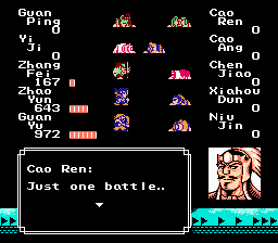 I only used Zhao Yun and I only used Luo Shi. No arrays. I went after Niu Jin first and got him down in two turns, with one of the Luo Shi’s taking off 1300 or so. Xiahou Dun followed and he was a bit harder, he repelled at least one Luo Shi from Zhao Yun. Cao Ren was next and his low soldier count was his downfall. I decided to leave Cao Ang for last since he’s rather harmless, and because I’ve had problems with Chen Jiao in this battle. My respect for Chen Jiao has gone up, he’s much more aggressive than I normally thought he was. Plus his 4200 soldiers take forever to take down, not to mention the fact that he is near Zhao Yun in intelligence so you’ll really have to get lucky to take him down. If you can manage to kill him, Cao Ang isn’t too tough. I ran out of TP killing Chen Jiao and had to all out Cao Ang, which is trouble because physical attacks are absolutely worthless in this battle.
