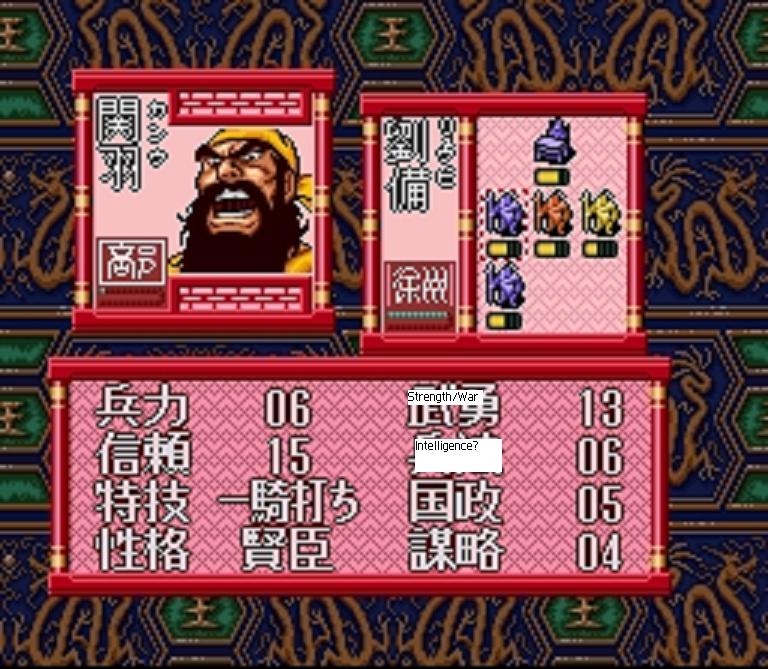 I’m pretty sure about the war ability and am sort of guessing on intelligence. This is Guan Yu obviously, as you see he has a high War ability. Zhang Fei has a 14 and Lu Bu a 15, so I assume that’s the highest. In comparison, Zhuge Liang has a 14 for the three in the lower-right so that doesn’t help to figure anything out. Maybe they’re Political and then Charm? If only we could get someone who comprehends Japanese to just tell us these basic things….