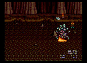 On this floor Alex should head north, skipping the first east exit but taking the second. After taking the second quickly go north and then west, following this path for a Chain Mail. In the very south part of the room you’ll get another Calm Herb and northeast of here is a Starlight. Continue north and go west when you can for a Jasmine and then take the south path. Take it all the way down and then west for an Herb and then north for a long long path that ends with another “boss”, the Truffle Troubler. If you’re rested and you take advantage of the flee option to keep some space between you and the monster, you should be able to burn it to death with the Blazing Fire without even getting touched. If you only have Flame it’ll take some more manuevering and buying time. Talk to the guy there at the end to get 50 EXP and when you leave an FMV of Vane.