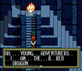 Then, go east keeping south for a Jasmine. Return to the previous screen and go east and then south for some Sun Drops, and then north through the stairs. Go west and take the north path for a Silver Light and then take the south path for more stairs. Follow the path for a Calm Herb and then continue east through some stairs, and then through the next linear path also until you get to the Jewel. Return all the way back to basement level with the Silver Light chest, and take the middle path going west. Follow this until you get to a staircase, which you should take for a Mint Essence. Now go west for another staircase, which you should take east for a Jasmine and then north for the stairs. Work your way east, taking the north path for an Herb of Althena. Return to the intersection before this and go south for the stairs. Just follow the path at this point, you’ll be at an area similar to what you had in the White Dragon’s Lair. Eventually you’ll get to a burning spirit, the spirit of the Red Dragon! He’ll give you his power, and you’ll get the Red Dragon Shield and the Dragon Fire spell. Dat’s a good deal for Alex, I’d say. Anyway return back and use Psychotron or whatever to get out of the cave. Reza is your next destination.