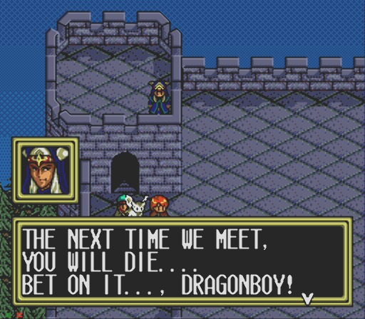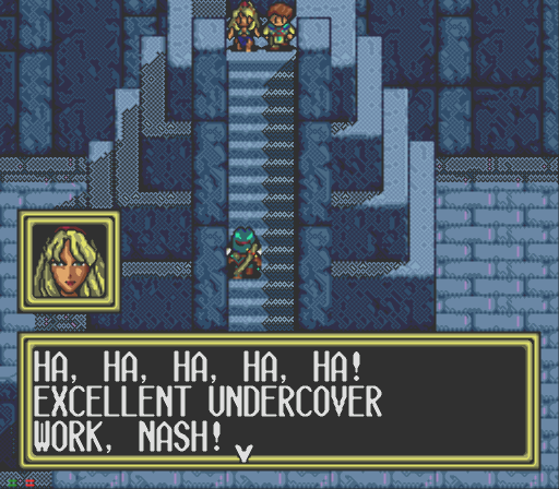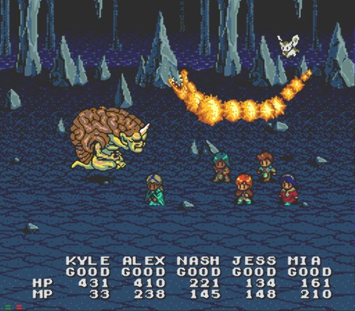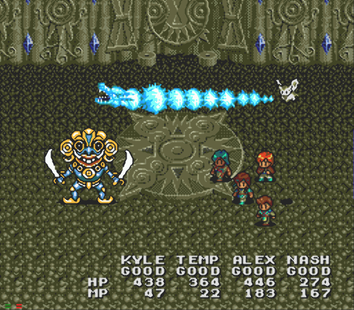 It’s the Brainiac, and he really isn’t too tough. Alex and Kyle are probably best off attacking, while Nash can cast his best spells (Thunder Shot 2, Thunder Thrust) and so can Mia (Blizzard). Dragon Fire is useful with Alex, and Jessica can probably just heal or attack. Head up and talk to the Blue Dragon, who will give you the Dragon Tear spell and the Blue Dragon Helmet. Before you leave, un equip Nash. Why? Because when you walk a bit further south, Xenobia will arrive and Nash will leave you with the Dragon Helmet. Why didn’t anyone stop the prick?