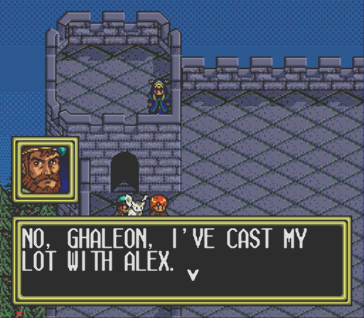 Third floor again, go west, south and fall in the tube. Second floor one more time, go east, continue, west, and then north. Third floor, go east, south, east, east and north. Did that work? Well talk to Myght a few times and he’ll agree to get the balloon for Alex thanks to Laike. Now go to the west and onto the roof to have a confrontation with Ghaleon. He’ll try to get Laike to turn against you but Laike’s got your back. Leave the lab now and back to Tamur.