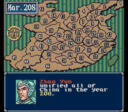 Meanwhile another force (led by Yuan Shu actually) comes along the west part of Sun Ce’s area and takes out Wu Ling and Ling Ling, and then occupies Yong An for the eventual trip to unify China. At this juncture, Liu Zhang had upwards of 150,000 troops gathered at Cheng Dou, although most of them were not his best officers (Zhang Ren, Lei Tong, Wu Lan). His other castles are guarded lightly, so we take Zi Tong and Jiang Zhou simultaneously. Cheng Dou is then forced upon, and our difference in General-quality is proven. People like Fu Tong, Liu Jun, and Wang Lei are maxed out for his army; you should have all the good Shu generals that like you naturally (because you’re Zhao Yun) and whomever else you recruited along the way. Finally, Yun Nan and Jian Ning are mopped up easily. Well, the scenario started off hard. Fortunately Zhao Yun made it much easier during the latter part.