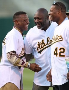 Rickey Henderson, Dave Stewart and Dave Henderson laughing it up at the 1989 Oakland Athletics 20-year reunion (gettyimages)